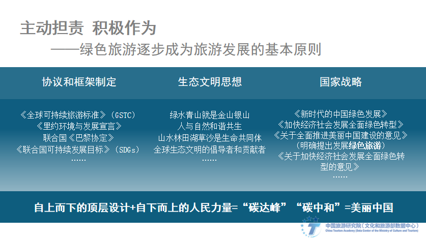 We pay more attention to the environment, take the initiative to take responsibility, and take positive actions. International standards and conventions such as the Global Sustainable Tourism Standard, the Rio Declaration on Environment and Development, the United Nations Paris Agreement, and the United Nations Sustainable Development Goals have been successively introduced. Xi Jinping's important conclusions on ecological civilization and green development concepts have provided theoretical compliance and ideological guidance for the development of green tourism in China in the new era.