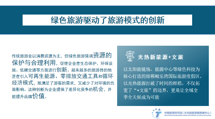 Summarizing the above industrial practices of green tourism, we found that green tourism has driven the innovation of tourism models. Traditional tourism is mainly based on consumption resources, but green tourism emphasizes the protection and rational use of resources, prompting companies to innovate in ecological protection, environmental protection facilities, low-carbon transportation, etc. More and more tourist destinations are introducing renewable energy, zero-emission vehicles and circular economy models, which not only meet the needs of tourists but also reduce the negative impact on the environment. This innovation provides companies with opportunities for differentiated competition and can enhance brand value. Handan Kunlewan International Tourism Resort, which is built with green technologies such as solar mirror fields and energy centers as the core, breaks the shackles of time with solar thermal energy, not only broadens the boundaries of "+ cultural tourism", but also makes all-region, all-season and all-weather possible.