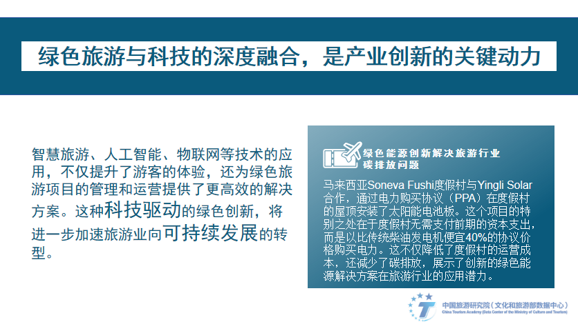 The deep integration of green tourism and technology is the key driving force for industrial innovation. The application of technologies such as smart tourism, artificial intelligence, and the Internet of Things not only enhances the experience of tourists, but also provides more efficient solutions for the management and operation of green tourism projects. This technology-driven green innovation will further accelerate the transformation of the tourism industry to sustainable development. Soneva Fushi Resort in Malaysia has partnered with Yingli Solar to install solar panels on the roof of the resort through a power purchase agreement (PPA). The special thing about this project is that the resort does not have to pay upfront capital expenditures, but instead purchases electricity at an agreed price that is 40% cheaper than traditional diesel generators. This not only reduces the resort's operating costs, but also reduces carbon emissions, demonstrating the potential for the application of innovative green energy solutions in the tourism industry.