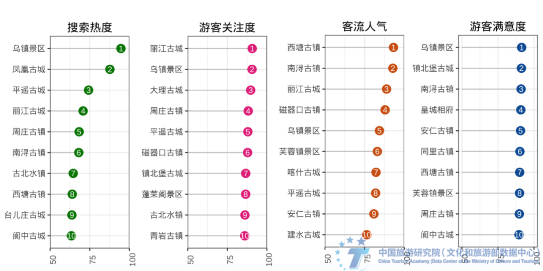 根据古镇景区游客满意度指数核密度分布,满意度较高古镇主要集中在江南水乡与川渝湘黔交界区域。具体从游客满意度TOP10来看,江南水乡古镇占有5席,分别为乌镇景区、南浔古镇、同里古镇、西塘古镇和周庄古镇,西南地区安仁古镇、芙蓉镇景区、阆中古城等位列其中。