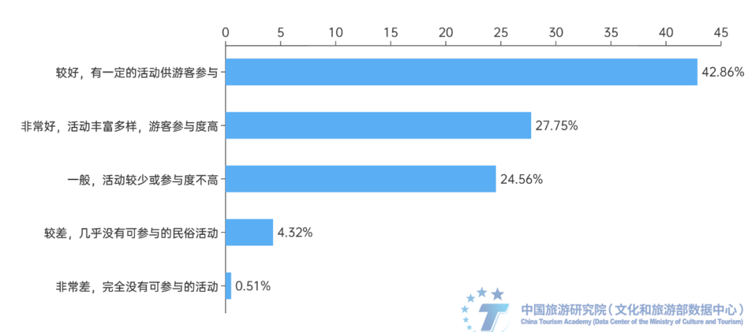 古镇民俗文化活动是文旅融合的重要载体。古镇为游客给予了活动空间,而古镇内民俗活动、民间舞蹈和音乐等则为游客的个人情绪调动和情感共鸣给予可能。调查显示,92.77%的受访者愿意参与当地民俗活动,其中传统节日庆典是最受欢迎的古镇民俗活动,占比达51.54%。其次是民间舞蹈或音乐表演,占比为40.8%。传统手工艺体验和特色民俗游戏分别占比为22.37%和26.19%。此外,对于古镇民俗活动的可参与性,超过半数的受访者认为较好或非常好,有一定的活动供游客参与,活动丰富多样,游客参与度高。